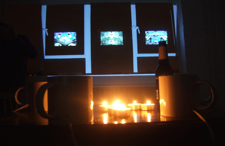 The recent installation at 'Machine Room' in North London invited the visitor to play with the playback of the piece. Three of the videos were controlled by sensors placed in the bottom of six mugs. Along with the sensors, I placed a single speaker. The visitors activated the work by placing the mugs to their ears. Once this was done the corresponding video would play back on a small screen stuck to a window pane. When the mugs were left on the table the videos stood still as individual paintings.